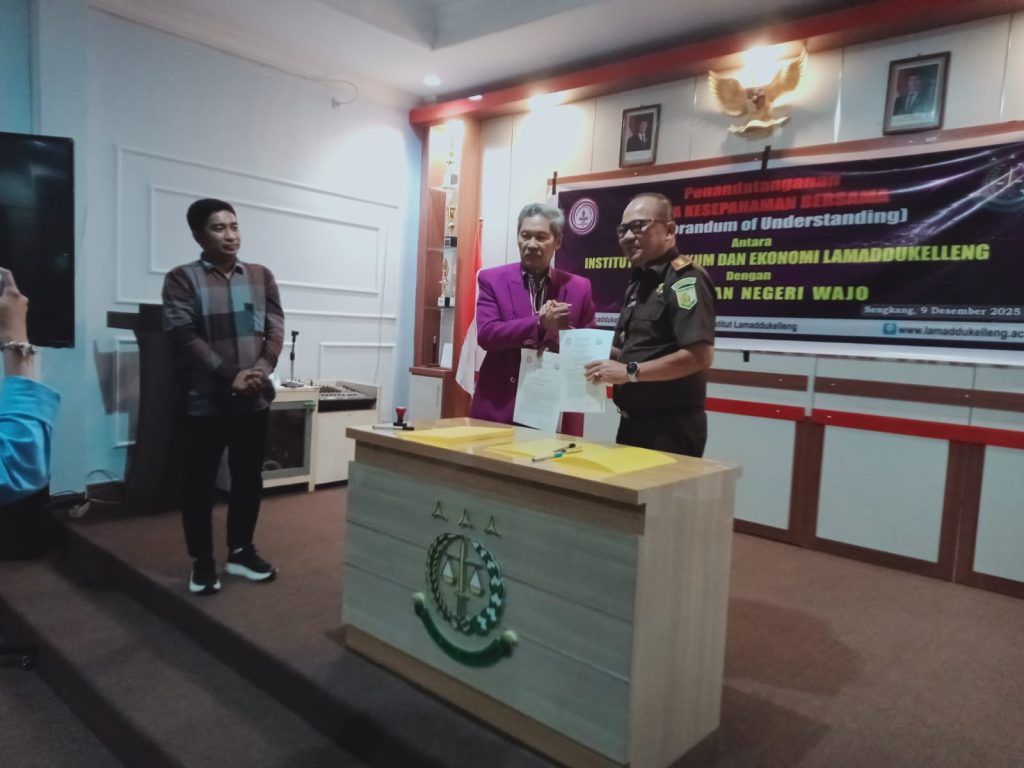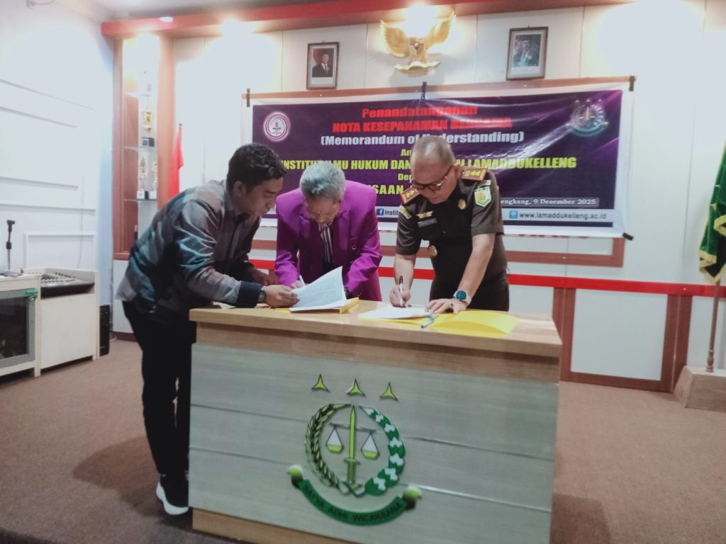 HUMAS– Penandatanganan Memorandum of Understanding (MoU) antara Institut Ilmu Hukum dan Ekonomi (IIHE) Lamaddukelleng dengan Kejaksaan Negeri Wajo terkait program “Magang Berdampak”, berlangsung di Kantor Kejaksaan Negeri Wajo, Selasa, 9 Desember 2025.